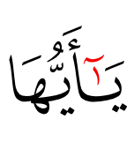 | 15:6:2 | يٰۤاَيُّهَا | یٰۤاَیُّهَا | یٰۤاَیُّهَا | يٰ٘اَيُّهَا | يٰٓاَيُّهَا | يَـٰٓأَيُّهَا | يـايها | يَٰٓأَيُّهَا | ﭼ | يَٰٓأَيُّهَا | يَا أَيُّهَا | يا ايها | يَٰٓأَيُّهَا |