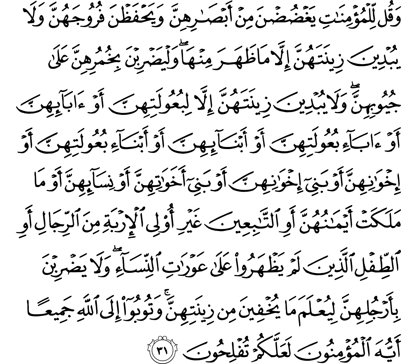 | 24:31:15 | وَلۡيَـضۡرِبۡنَ | وَلْیَضْرِبْنَ | وَلْیَضْرِبْنَ | وَلْيَضْرِبْنَ | وَلْيَضْرِبْنَ | وَلْيَضْرِبْنَ | وَلْيَضْرِبْنَ | ﮟ | وَلْيَضْرِبْنَ | وَلْيَضْرِبْنَ | وَلۡيَضۡرِبۡنَ |