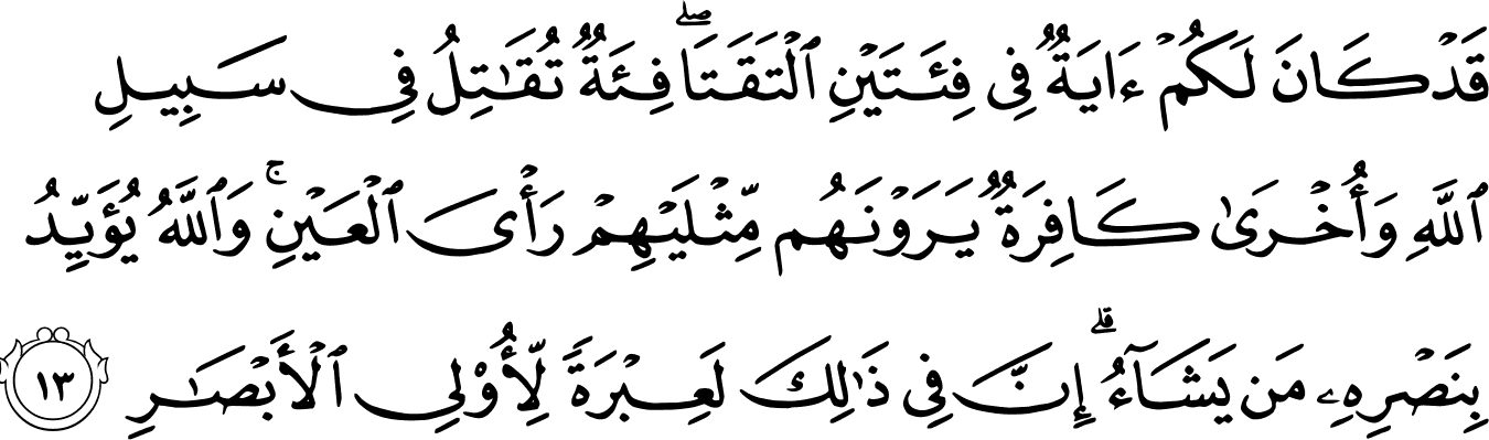 | 3:13:7 | الۡتَقَتَا ؕ | الْتَقَتَا ؕ | الْتَقَتَا ؕ | الْتَقَتَاﵧ | الْتَقَتَاؕ | ٱلْتَقَتَا ۖ | ٱلْتَقَتَاۖ | ﮅﮆ | ٱلْتَقَتَاۖ | الْتَقَتَا ۖ | ٱلۡتَقَتَاۖ |