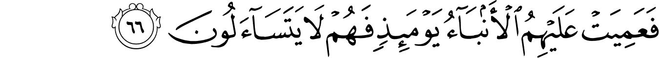 | 28:66:1 | فَعَمِيَتۡ | فَعَمِیَتْ | فَعَمِیَتْ | فَعَمِيَتْ | فَعَمِيَتْ | فَعَمِيَتْ | فعميت | فَعَمِيَتْ | ﮩ | فَعَمِيَتْ | فَعَمِيَتْ | فعميت | فَعَمِيَتۡ | فَعَمِيَتۡ | ﲙ | ﲙ |