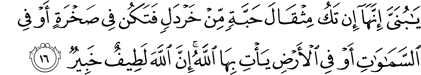 | 31:16:6 | حَبَّةٍ | حَبَّةٍ | حَبَّةٍ | حَبَّةٍ | حَبَّةٍ | حَبَّةٍۢ | حبة | حَبَّةࣲ | ﮮ | حَبَّةࣲ | حَبَّةٍ | حبة | حَبَّةٖ |