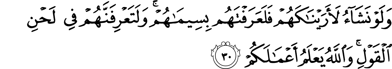 | 47:30:4 | فَلَعَرَفۡتَهُمۡ | فَلَعَرَفْتَهُمْ | فَلَعَرَفْتَهُمْ | فَلَعَرَفْتَهُمْ | فَلَعَرَفْتَهُمْ | فَلَعَرَفْتَهُم | فلعرفتهم | فَلَعَرَفْتَهُم | ﭔ | فَلَعَرَفْتَهُم | فَلَعَرَفْتَهُم | فلعرفتهم | فَلَعَرَفۡتَهُم |