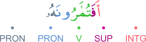| 53:12:1 | اَفَتُمٰرُوۡنَهٗ | اَفَتُمٰرُوْنَهٗ | اَفَتُمٰرُوْنَهٗ | اَفَتُمٰرُوْنَهٗ | اَفَتُمٰرُوْنَهٗ | أَفَتُمَـٰرُونَهُۥ | افتمـرونه | أَفَتُمَٰرُونَهُۥ | ﮈ | أَفَتُمَٰرُونَهُۥ | أَفَتُمَارُونَهُ | افتمارونه | أَفَتُمَٰرُونَهُۥ |