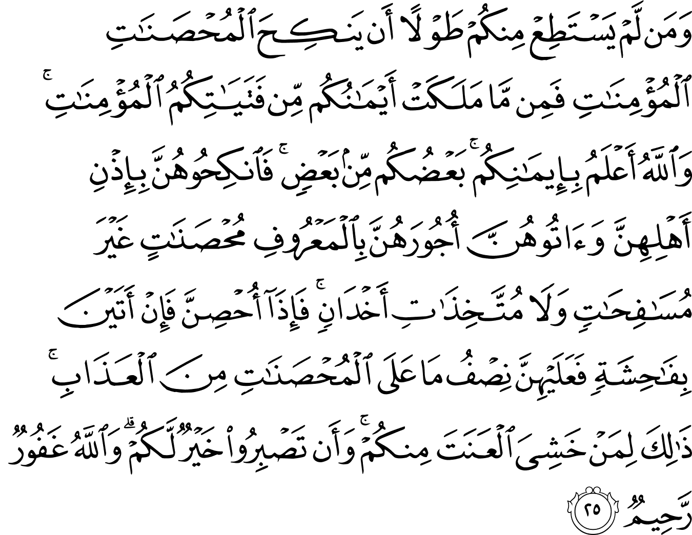 | 4:25:23 | فَانْكِحُوۡهُنَّ | فَانْكِحُوْهُنَّ | فَانْكِحُوْهُنَّ | فَانْكِحُوْهُنَّ | فَانْكِحُوْهُنَّ | فَٱنكِحُوهُنَّ | فَٱنكِحُوهُنَّ | ﮛ | فَٱنكِحُوهُنَّ | فَانكِحُوهُنَّ | فَٱنكِحُوهُنَّ |