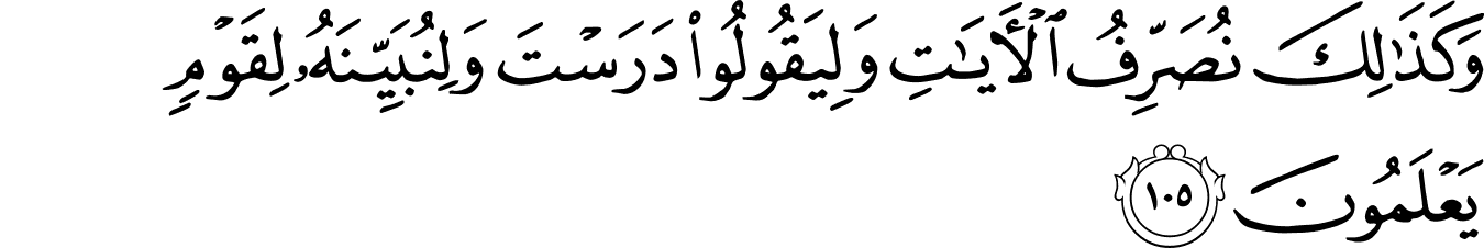 | 6:105:2 | نُصَرِّفُ | نُصَرِّفُ | نُصَرِّفُ | نُصَرِّفُ | نُصَرِّفُ | نُصَرِّفُ | نُصَرِّفُ | ﮄ | نُصَرِّفُ | نُصَرِّفُ | نُصَرِّفُ | نُصَرِّفُ | ﱴ | ﱴ |